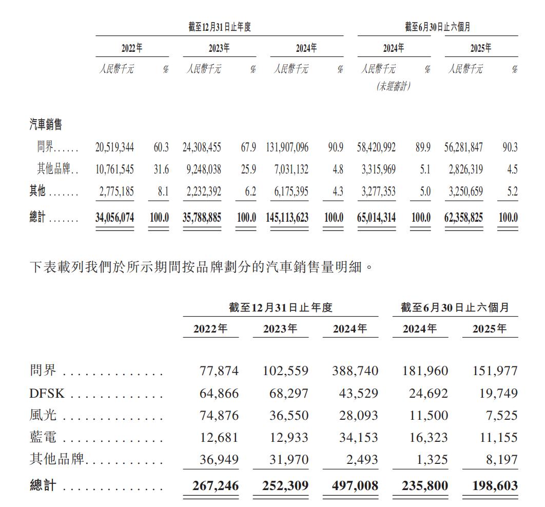 进入2025 年,这一趋势仍在延续:前三季度营收达到 1105 亿元,同比微增 3.67%;净利润为 53.12 亿元,同比增长 31.56%。在2025年上半年,问界品牌累计销量占赛力斯总销量的76.5%,对应营收占比90.3%。