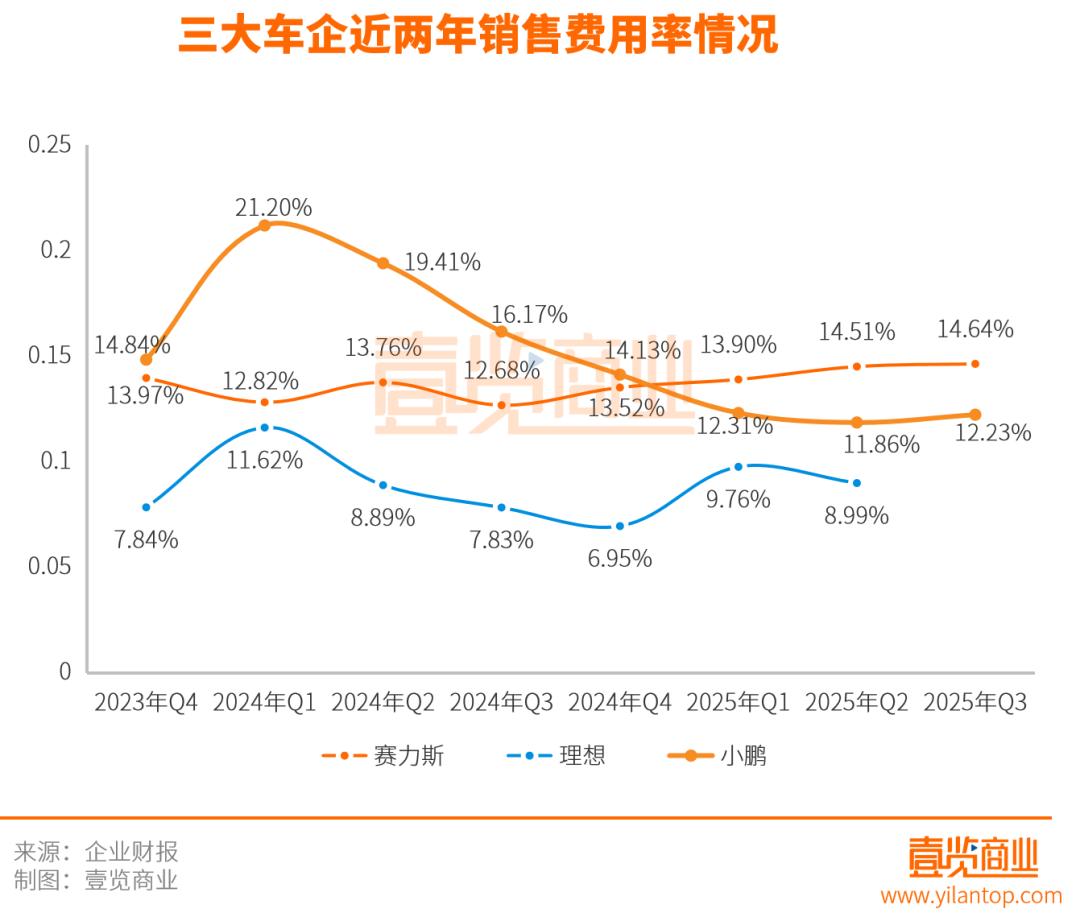 对比同样已实现盈利的同行来看,理想的销售费用率一直保持在10%以下,小鹏的销售费用率虽然在今年之前都远高于赛力斯,但今年销售费用率在逐渐走低,特别是今年,开始远远低于赛力斯。