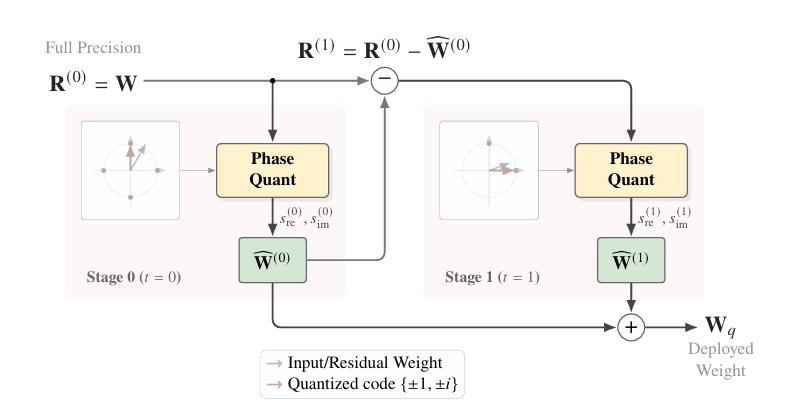 该框架通过广泛线性表示将实数模型无损转换为复数形式,再结合相位感知量化与递归残差量化,实现了在仅2比特的情况下,性能接近全精度模型的突破性进展。