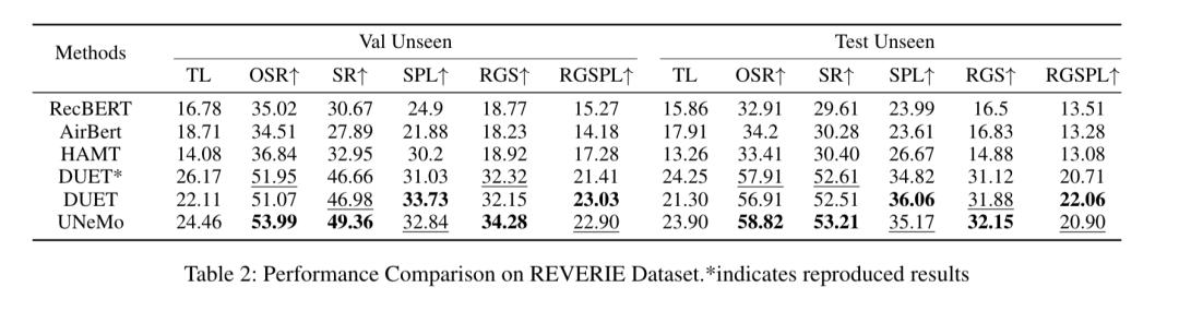 为进一步验证UNeMo协同训练架构的通用性与可拓展性,团队将其迁移至不同类型的导航基线(DUET)与目标导向导航数据集REVERIE,开展跨场景验证。
