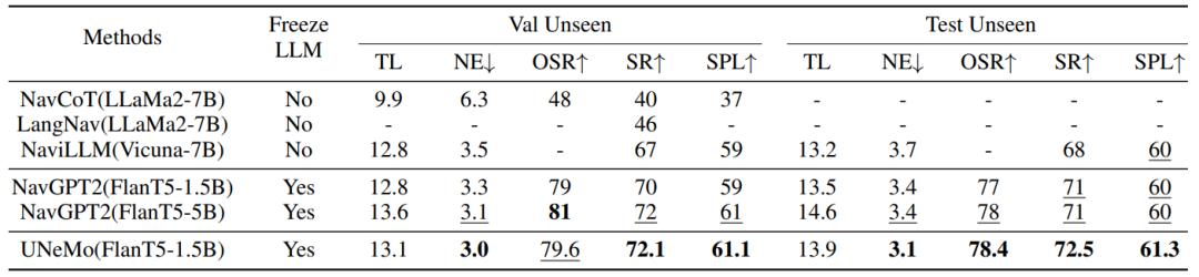 在VLN领域核心数据集R2R的实验中,UNeMo在轻量化配置与高性能决策的平衡上实现了关键突破。