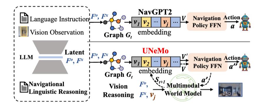 总的来说,UNeMo针对传统VLN方法推理与决策脱节、资源消耗高的问题,以 “多模态世界模型+分层预测反馈导航器” 协同架构破解痛点。