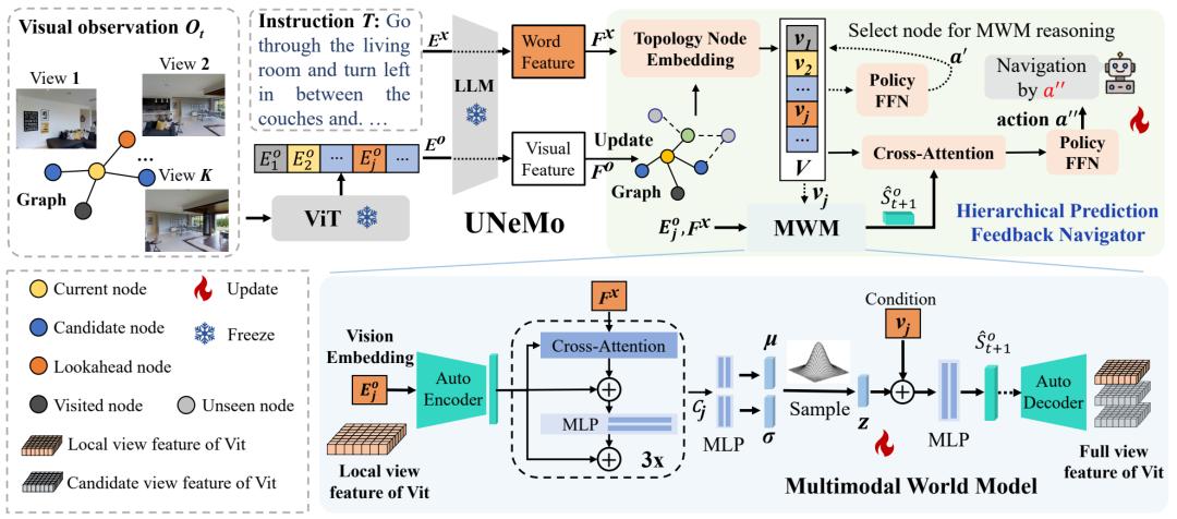 于是研究团队提出了UNeMo框架,其核心突破在于构建了“多模态世界模型(MWM)+分层预测反馈导航器(HPFN)”的双向协同架构,将视觉状态推理与导航决策深度绑定,从根本上解决现有方法的脱节问题。