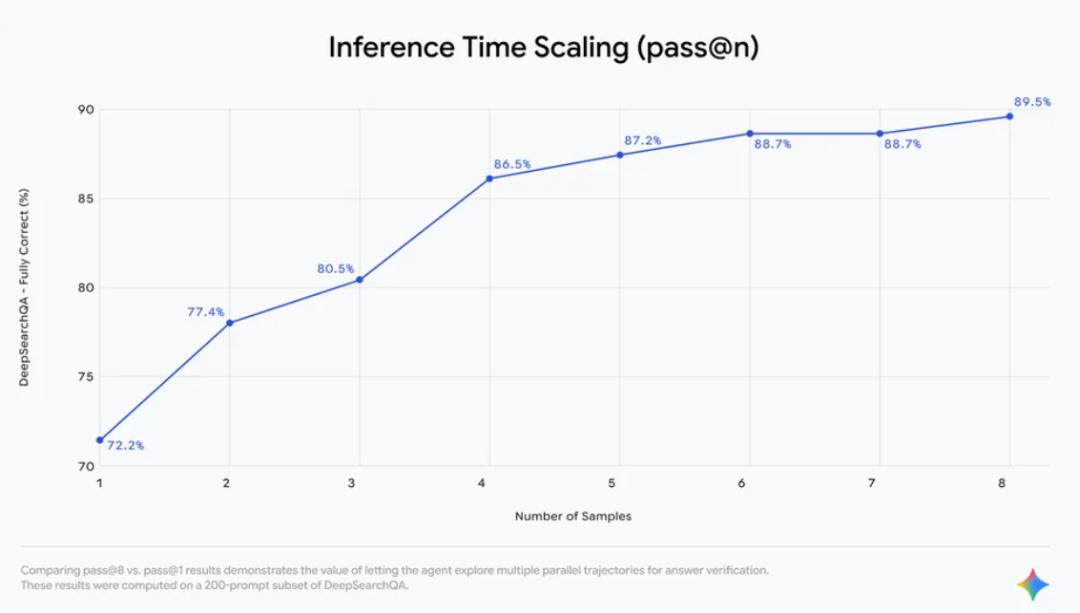 DeepSearchQA还可以作为衡量“思考时长”效率的工具。谷歌在内部评估中发现,当允许Agent执行更多搜索与推理步骤时,其性能会获得显著提升。