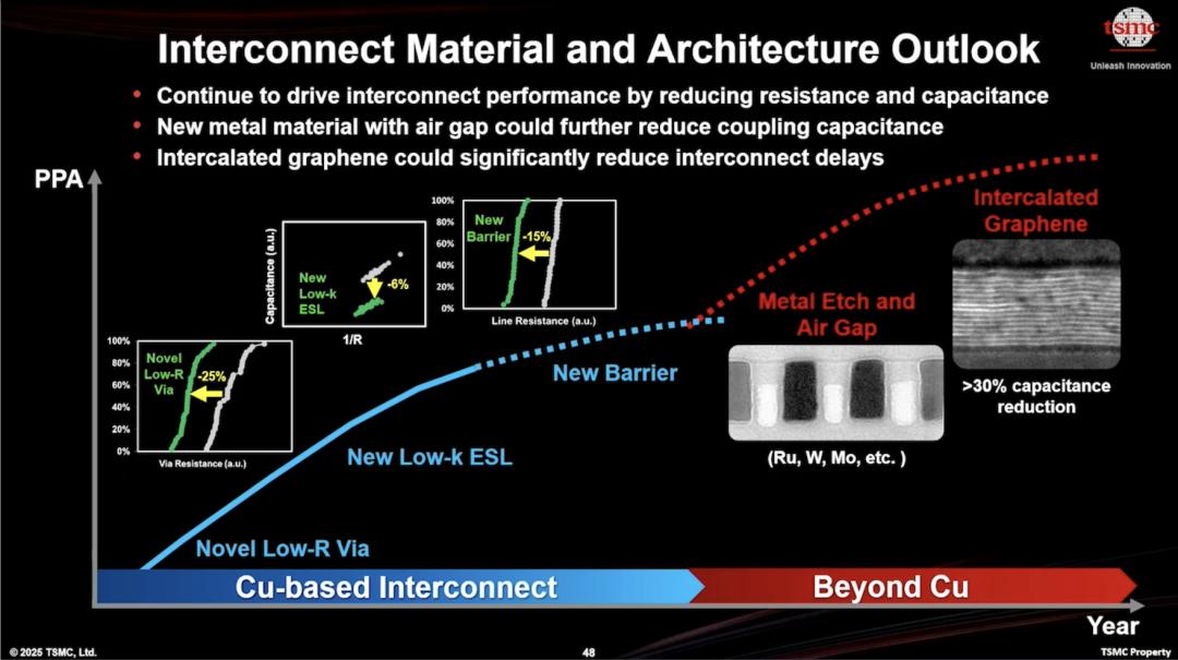 除了铜之外,目前正在研发具有气隙的新型金属材料,这种材料有望进一步降低电阻和耦合电容。插层石墨烯是另一种极具前景的新型金属材料,未来有望显著降低互连延迟。相关研究成果概述如下图所示。