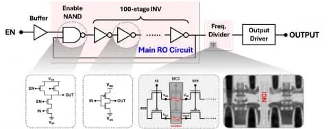 环形振荡器由一个使能 NAND 逻辑元件(环形振荡器输出的反馈元件)和 100 个反相器元件组成,从而形成一个 101 级环形振荡器。环形振荡器原型的工作电压范围为0.5V至0.95V。随着电源电压的升高,振荡频率增大,振荡频率的波动减小。振荡频率的具体数值未予公开。