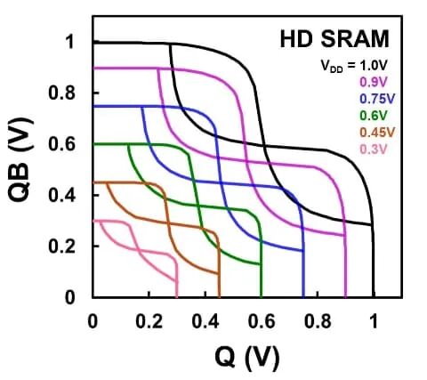 原型HD型SRAM单元的工作电压范围为0.3V至1.0V。当电源电压为0.75V时,读取静态噪声容限(RSNM)为135mV,读取电流为17.5μA,写入容限(WM)为265mV。该SRAM单元参数尚未优化,仍有改进空间。