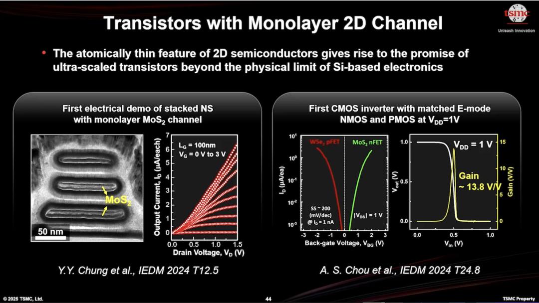 根据Yuh-Jier Mii在IEDM 2024年报告称,采用二维沟道材料的晶体管也取得了显著进展。台积电已首次展示了采用与N2技术类似的堆叠纳米片结构中的单层沟道晶体管的电性能。此外,还开发了一种采用匹配良好的N沟道和P沟道器件、工作电压为1V的反相器。这项工作总结如下图所示。