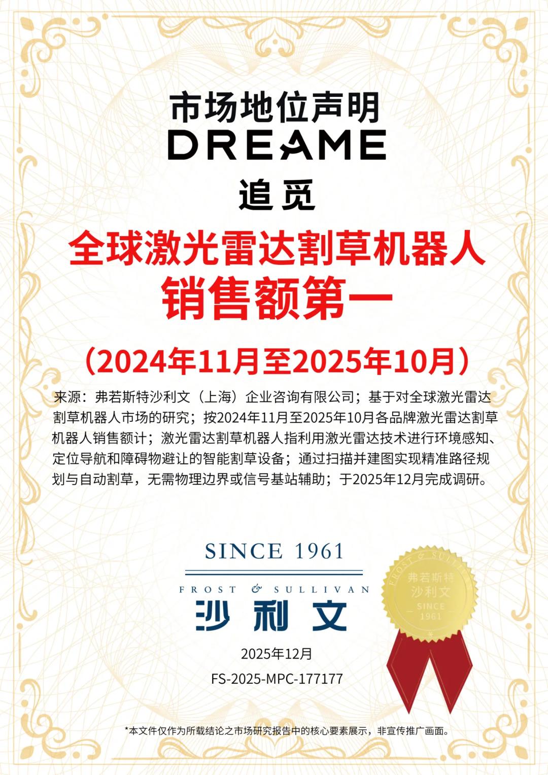 然而,变局正在发生。近日,国际权威咨询机构沙利文授予追觅割草机器人“全球激光雷达割草机器人累计销售额第一”的认证,将行业的聚光灯重新打向了技术腹地。