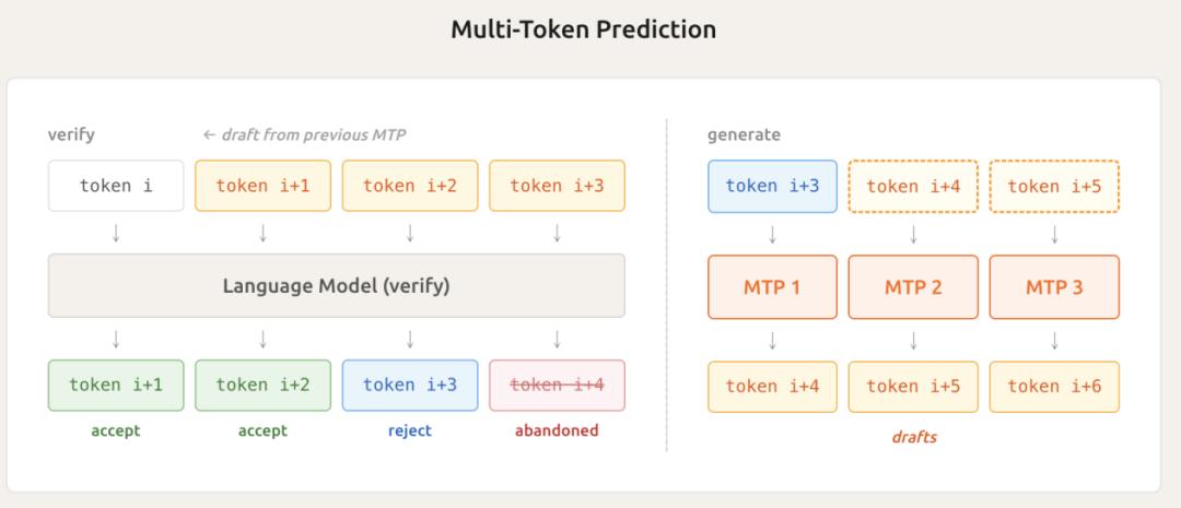 这种“一次预测、并行验证”的机制有效提升了推理效率,加载3层MTP模块后可实现2-2.6倍的实际推理加速比。