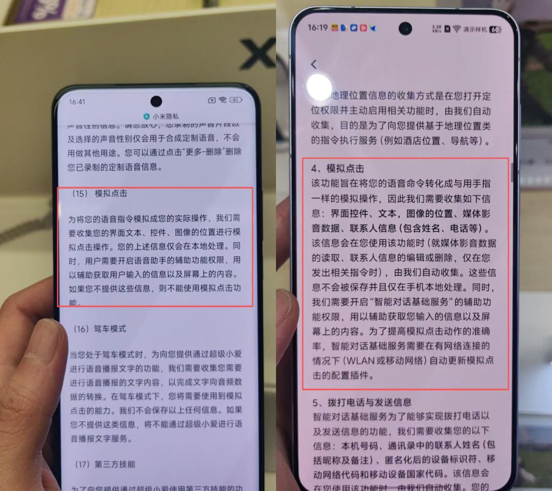 小米和vivo则将模拟点击作为单独条例列出来,表示“该功能旨在将您的语音命令转化成与用手指一样的模拟操作,我们需要收集如下信息:界面控件、文本、图像的位置、媒体影音数据、联系人信息等。同时,需要开启辅助功能权限,用以辅助获取您输入的信息以及屏幕上的内容”。
