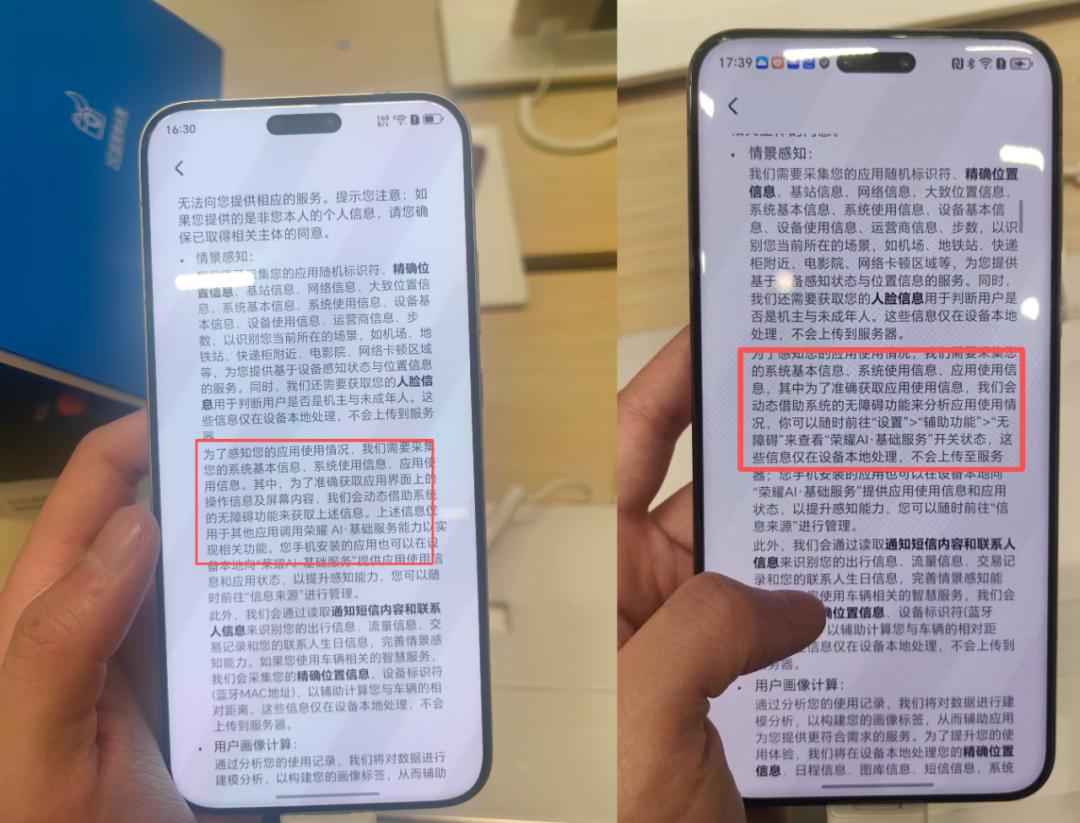 例如,荣耀新机Magic 8的《关于荣耀AI基础服务与隐私的声明》中,关于“情景感知”条例明确写道:“为准确获取应用界面上的操作信息及屏幕内容,我们会动态借助系统的无障碍功能来获取上述信息。”相比上一代Magic 7“为了准确获取应用使用信息,我们会动态借助系统的无障碍功能来分析应用使用情况”的表述,新机条例中着重提到“获取应用界面上的操作信息及屏幕内容”。