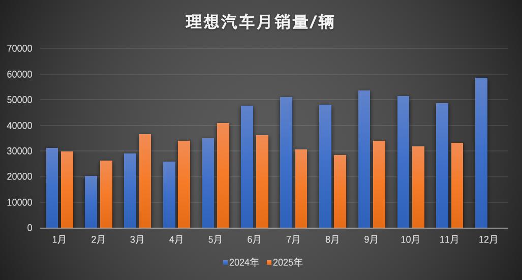 事实上,理想这辆高速增长的列车从今年6月开始进入下滑通道。今年6月,理想汽车交付了36279辆,比去年6月少了将近1万辆,此后,7-11月,每个月的销量都远低于去年同期水平。