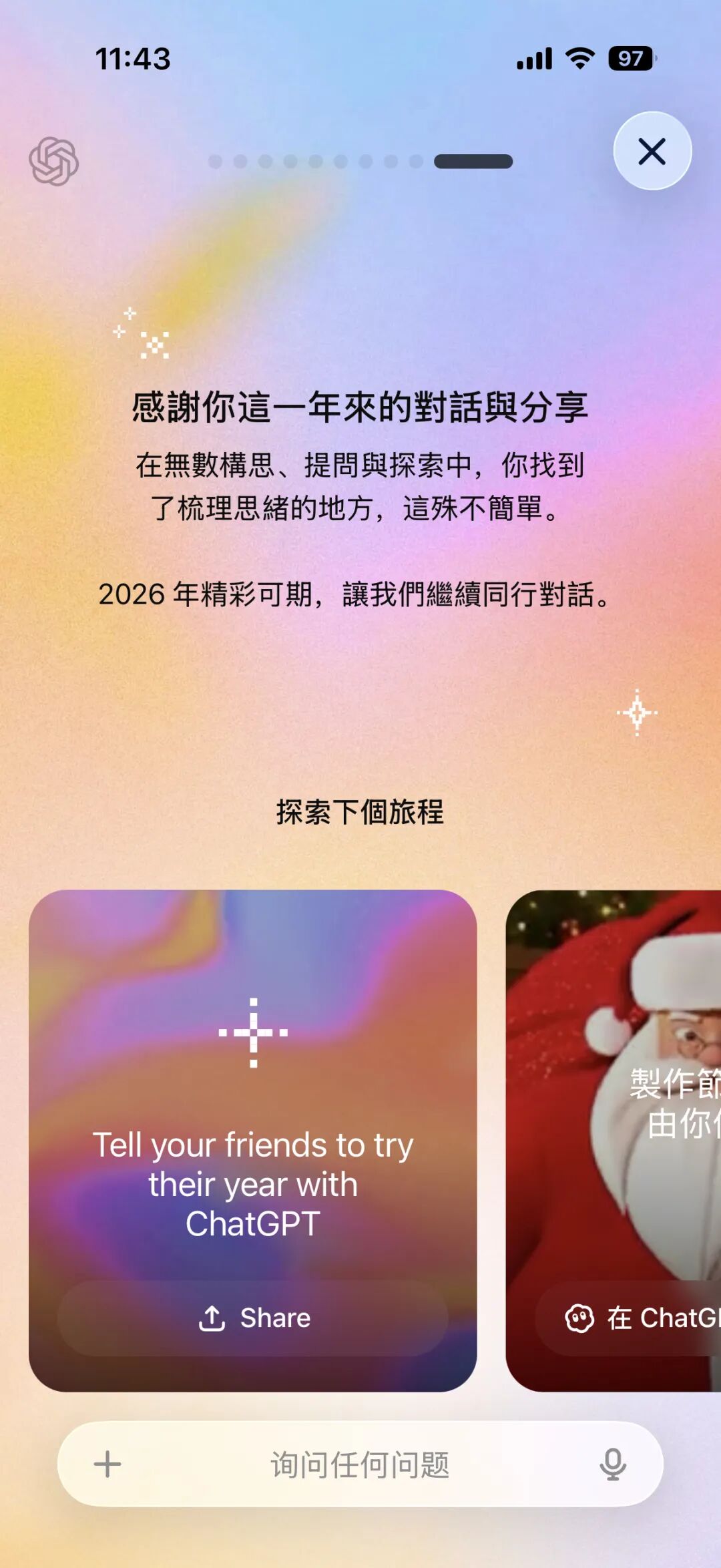 获取方式很简单,在 App 对话框中输入一句咒语:「Show me my year with ChatGPT.」(给我看看我和 ChatGPT 的这一年。)