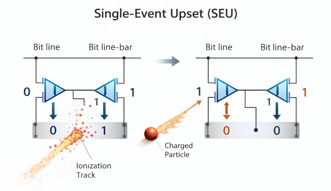单粒子翻转(SEU)示意图:高能粒子穿过芯片时,可能将存储单元的"0"翻转为"1"