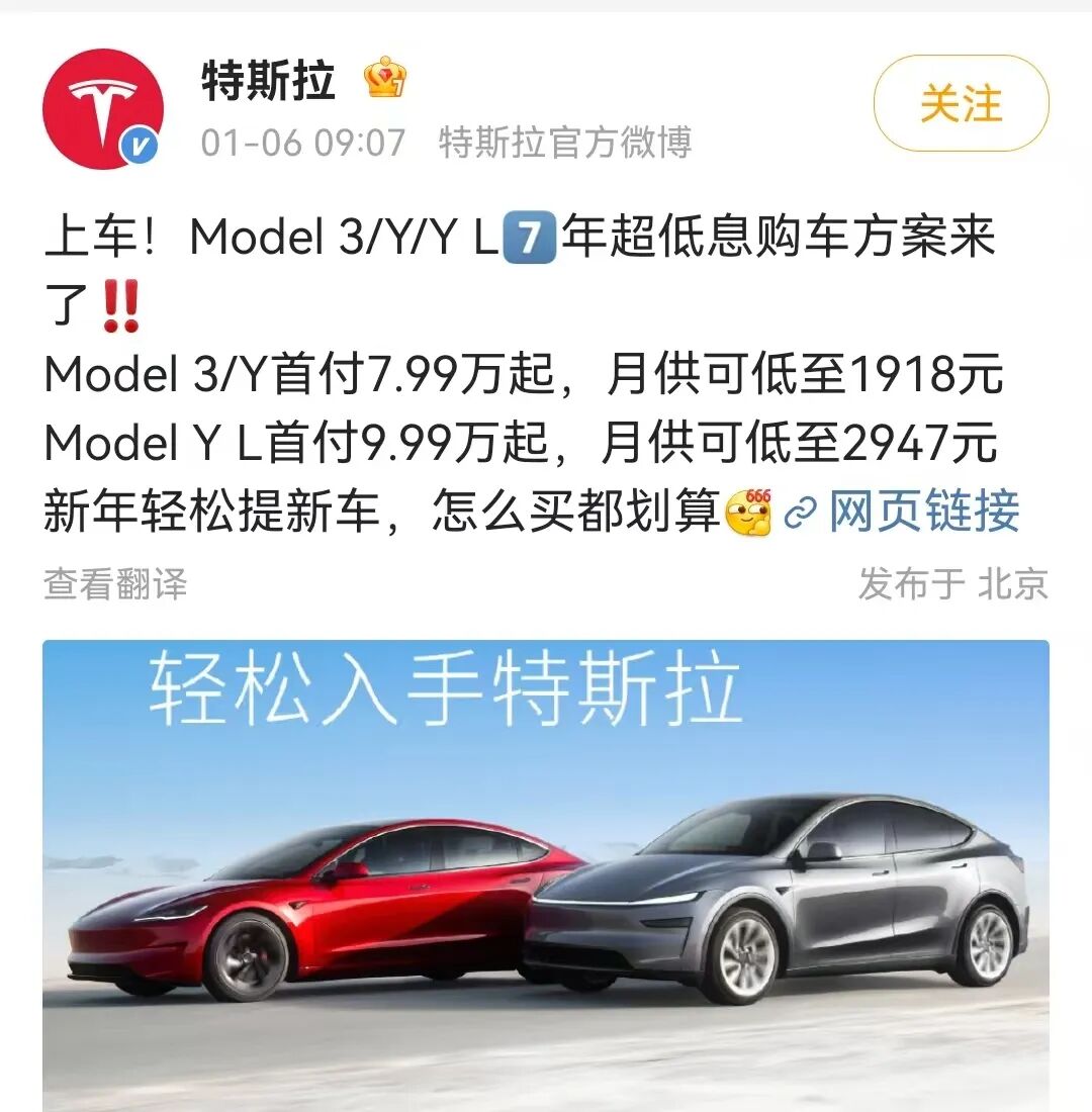 1月6日,特斯拉中国针对旗下多款车型推出新一轮金融方案,以更具弹性的支付策略激活市场消费。此次政策覆盖Model 3、Model Y及Model Y L等主力车型,提供长达7年的低息分期,且所有参与车型均可享受5年免息分期。