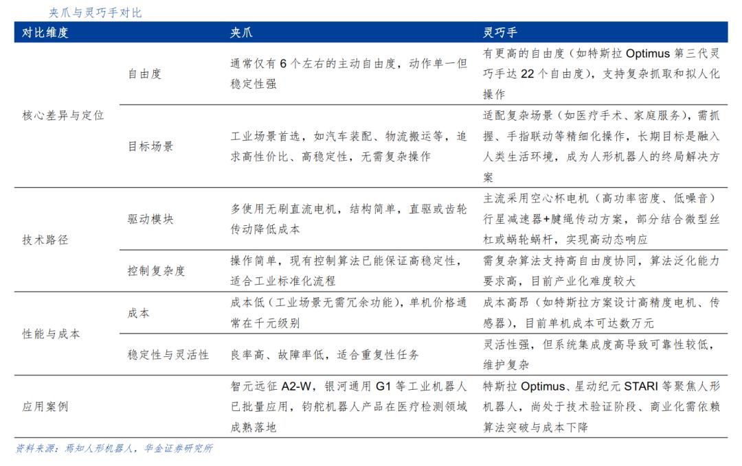 传统夹爪或抓持手已经在工业装配、医疗检测等领域实现应用,但由于其仅针对标准化流程进行设计,因此泛化能力有限。灵巧手结构与人手相似,具有高自由度、高精度等特点,可以与人形机器人搭配执行多种复杂任务,如抓握小型物体、搬运物品等,在工业场景、商业场景、家用场景中均有较大的应用潜力。