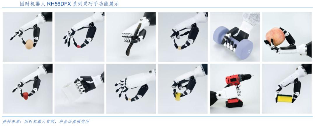 除上述整机厂外,还有大量零部件厂布局灵巧手,因时机器人的末端执行器包含RH56BFX系列、RH56DFX系列、RH56E2系列灵巧手以及EG2-4B系列和EG2-4C系列伺服电动夹爪。其中RH56DFX系列为仿人五指灵巧手,单指抓握力达到1.5kg,±0.2mm重复定位精度、0.5N力分辨率,另外整手重量仅540g。因时机器人的灵巧手可实现抓取鸡蛋、水果、杠铃、以及握持杯子、工具等动作,可满足精细化作业需求。
