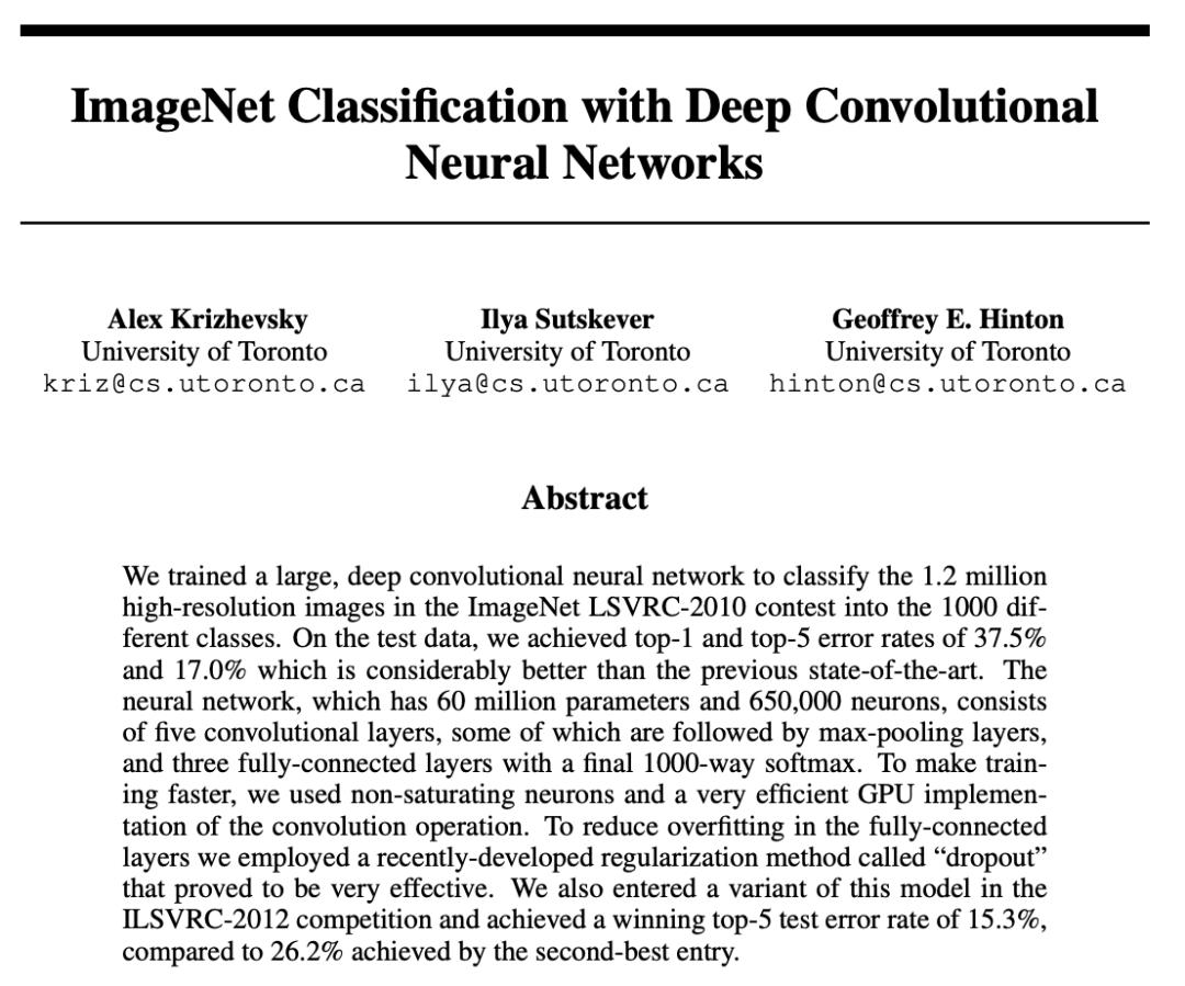 辛顿找来了自己的两个学生——Ilya Sutskever和Alex Krizhevsky,两人都是出生于苏联的犹太人,前者极具数学天赋,后者擅长工程实现。三人密切配合,创建了一个新神经网络,参加了ImageNet图像识别大赛。