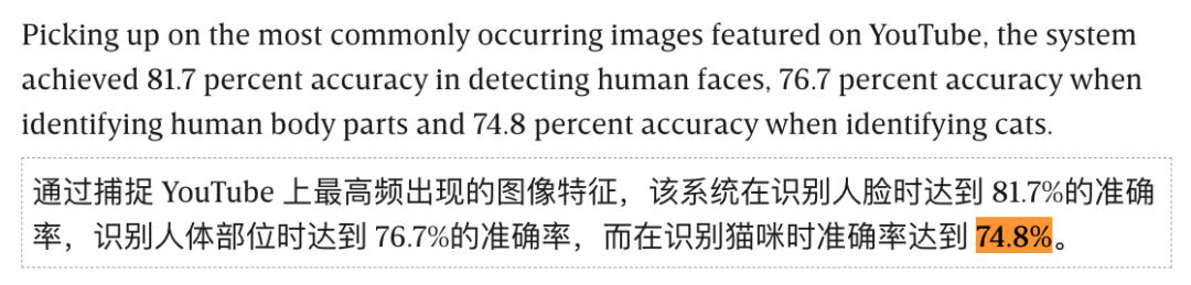 谷歌猫搭建了一个神经网络,动用了遍布谷歌各个数据中心的16000个CPU进行训练,最终实现74.8%的识别准确率。