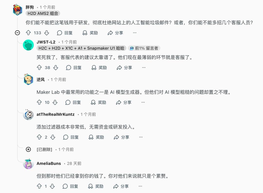 拓竹也在经历类似的阵痛。近期因为开源与闭源上的策略调整,在 Reddit 社群中引发了大量的讨论,对于一部分核心用户来说,这甚至被视为品牌价值观的动摇,进而影响到此前积累的品牌资产。
