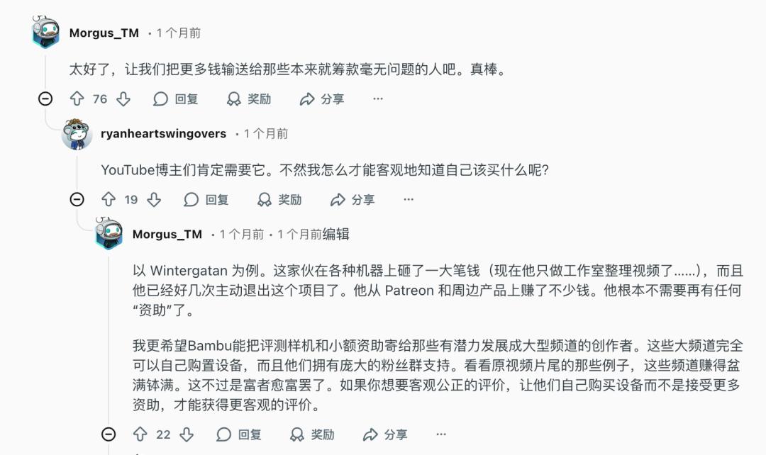 在拓竹官方发布的创作者激励计划评论区,用户发表了负面意见(截图来自 Reddit)