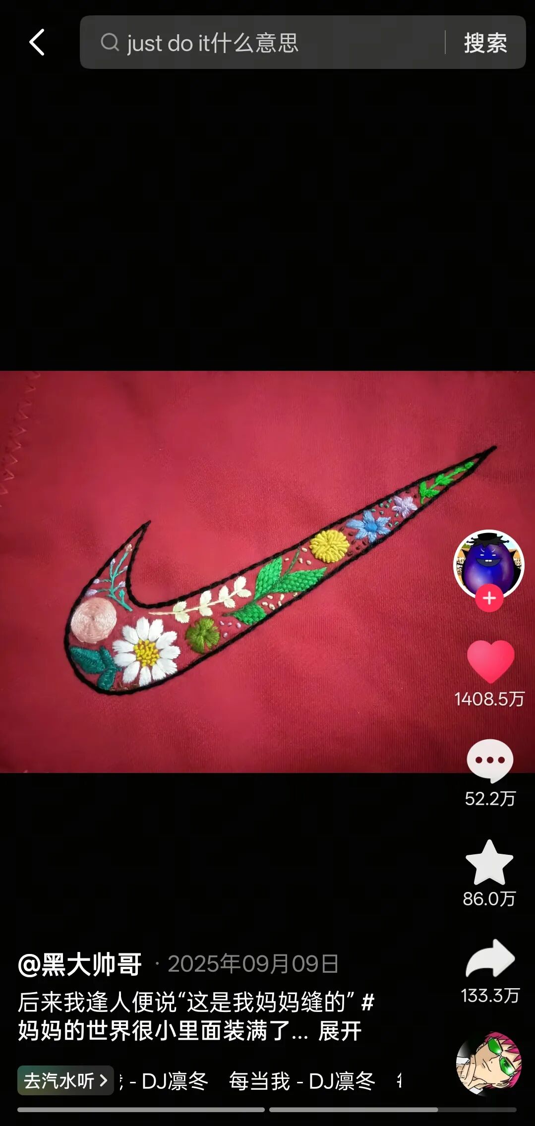 Nike 也是如此。Just Do It 从来不是关于精英竞技,而是关于普通人的坚持。抖音上一位网友分享母亲亲手为自己缝制 Nike 标志的故事,迅速获得上千万点赞。Nike 迅速回赠礼物、复刻这枚手工 Logo,并写下感谢信。品牌赞美的是投入与行动本身。
