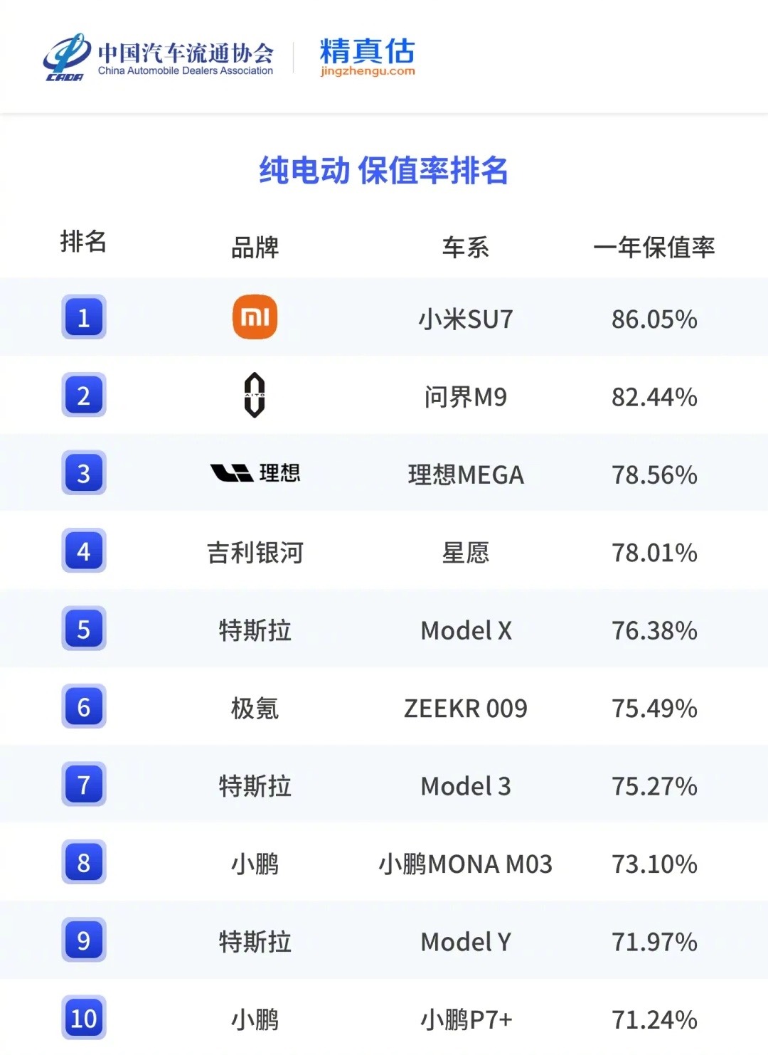 1月27日,中汽协发布了《2025年度中国汽车保值率报告》。当中显示,小米SU7在纯电动车领域取得第一名,一年保值率高达86.05%。紧随其后的是问界M9EV、理想MEGA、吉利星愿以及特斯拉ModelX,而特斯拉的销量主力Model 3,仅位列第七名。