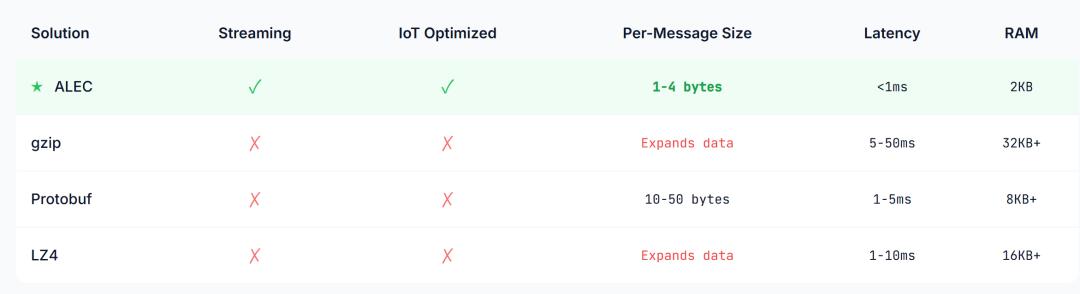 在此背景下,无论是在农业、制造、物流还是能源领域,企业管理大规模传感器设备群的核心挑战,正从“如何连接”转变为“如何可持续地连接”。随着设备数量和数据量激增,数据传输成本、电池寿命以及网络扩容成本,逐渐成为制约物联网创新落地的关键经济约束。以传输环节为例,诸如 gzip 这样的传统压缩方案是为文件设计的,而不是为物联网流式数据设计的,当用户使用 gzip 压缩一条 24 字节的消息时,反而会变大。