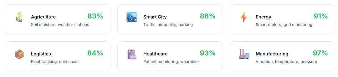 为了展示 ALEC 技术的实际价值,这家初创公司在多个行业场景中进行了验证:农业领域,ALEC 应用于土壤传感器,压缩率达到 83%,不仅显著减少了数据传输量,还将传感器电池寿命从原来的 6 个月延长至 3 年以上,大幅降低了运维成本;制造业场景中,该技术用于振动监测系统,实现了高达 97% 的数据压缩率,使企业能够在无需升级现有网络的情况下部署多达 2000 个传感器,从而显著提升设备监控覆盖率和生产线可靠性;智慧城市建设中,ALEC 同样展现出高效的数据处理能力,其被应用于停车传感器、空气质量监测以及交通管理系统,使数据量减少了约 86%,为城市管理部门提供了更经济、可持续的数据采集与分析方案。