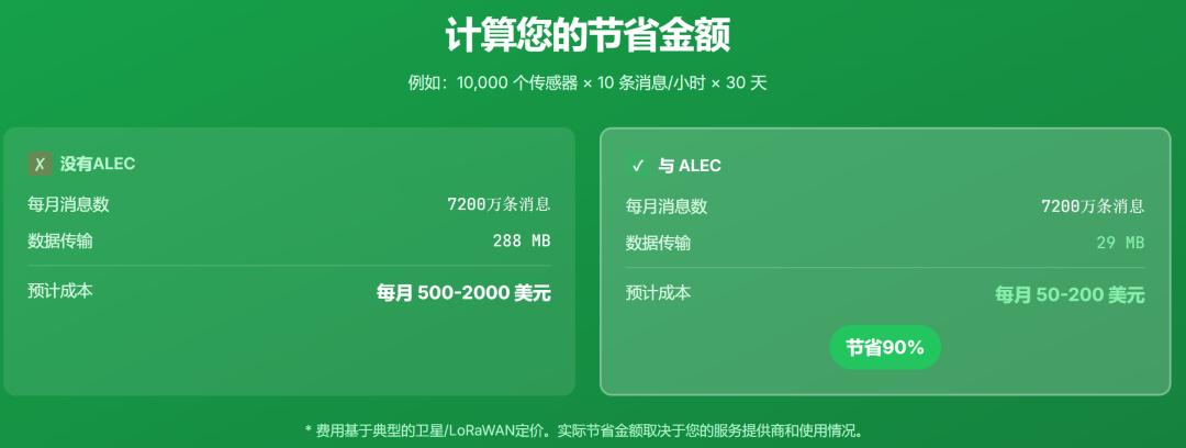 这些价值也可以换算成给客户的直接收益,ALEC 在其官网举了这么一个非常直观的例子:假设某用户有 10000 个传感器,每天都需要每个小时传输 10 条消息,费用基于典型的卫星/LoRaWAN 定价来计算,那么没有 ALEC 技术之前每月的数据传输成本大约为 500-2000 美元,而使用 ALEC 技术后每月成本可降低 50-200 美元,成本节省高达 90%。