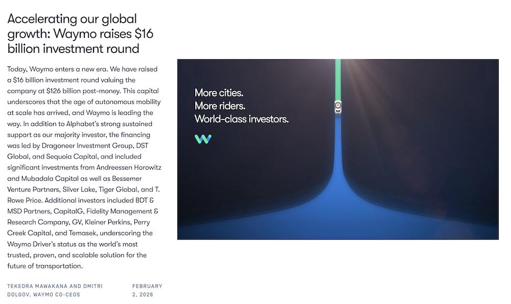 160亿美元,约合人民币1110亿的融资,谷歌母公司Alphabet旗下自动驾驶公司Waymo在其官网上宣布已完成交易。