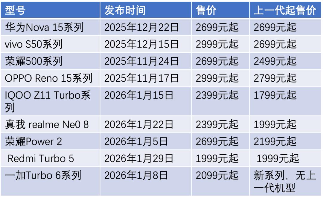 Tech星球统计发现,从2025年11月至2026年1月,各大手机品牌共发布9款机型,价格大多位于2000元-4000元的中端机型。