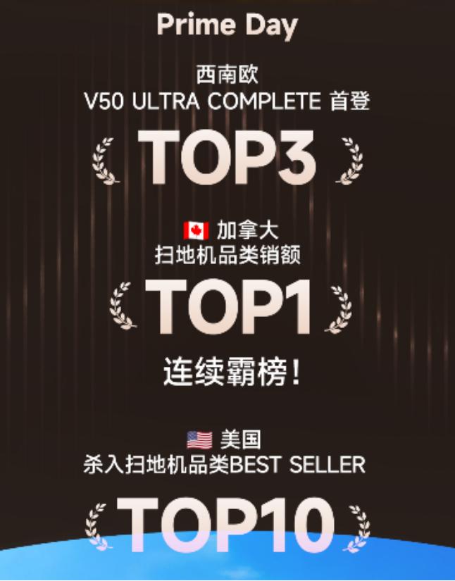 数据显示,2025年西南欧黑五期间,其扫地机器人品类在高端市场实现2亿元GMV,三款主力机型覆盖从入门到高端的价格带,进入全平台销量前二十。在北美市场,Prime Day期间进入扫地机品类Best Seller榜单前十。