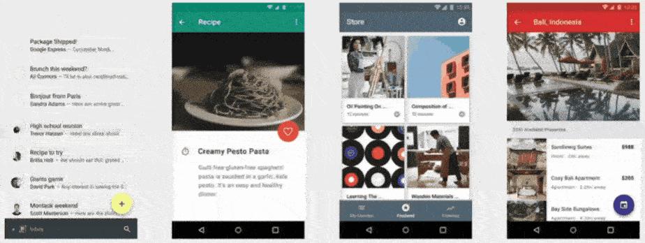 说回 UI,谷歌不仅通过配色与阴影模拟纸张的质感,交互也成为了构建界面逻辑的重要部分。每一个组件都拥有厚度、深度,且会随着点击或滑动呈现不同的动态。这一代语言中谷歌也加入了不同组件之间在层级与移动阻尼中相互影响的逻辑,使得大量页面呈现出恰如其分的弹性,像是在及时回应用户的实际操作。