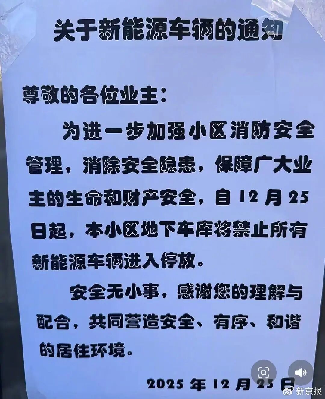 这源于2025年12月23日那张突然贴在电梯里的通知。物业宣布:12月25日起,小区地下车库禁止所有新能源车辆进入停放。闸机口的权限被一键取消,赵晋源的绿牌车,被拦在了自家门口。