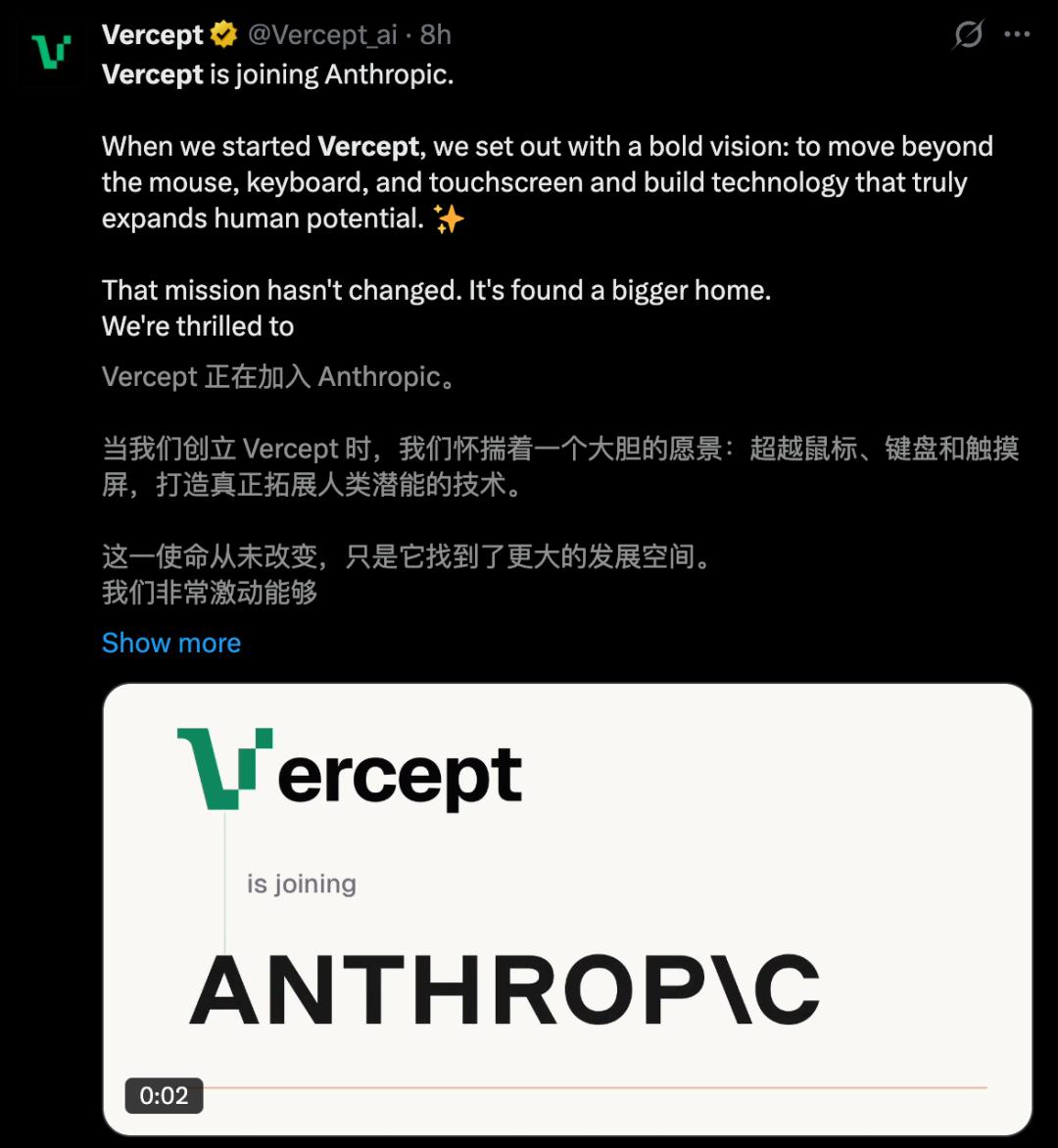 今天,Anthropic正式宣布收购AI初创公司Vercept。