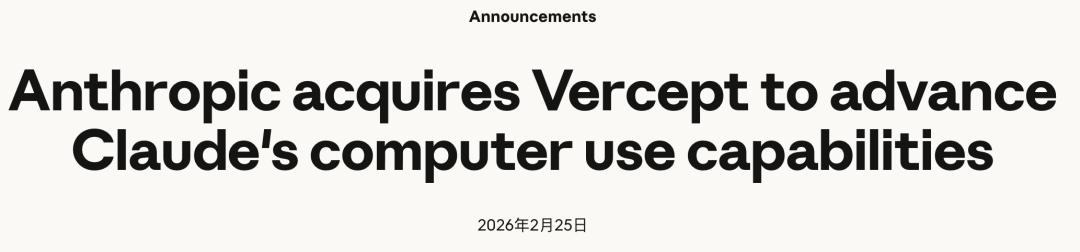 同在今天,Anthropic闪电收购初创Vercept,核心能力将在未来几周并入Claude。