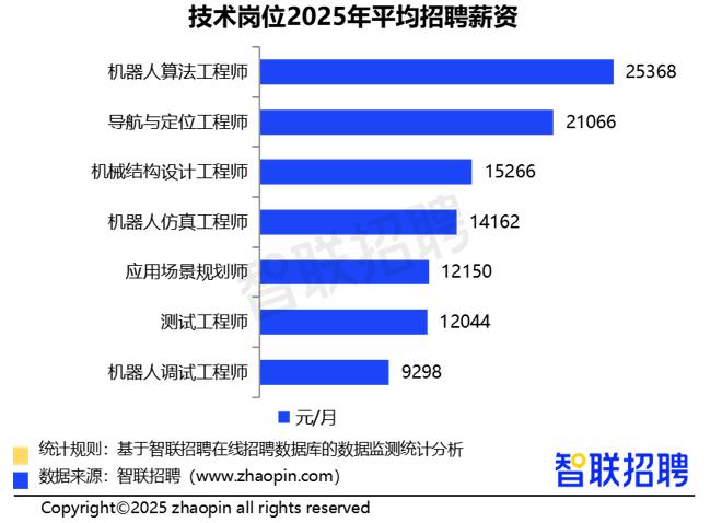 智联招聘《2025年机器人产业人才发展报告》显示,招聘增长领先细分职业中,机器人算法工程师平均招聘薪资居首,达25368元/月,拥有5年以上工作经验的机器人算法工程师,平均招聘薪资更是高达33665元/月;导航与定位工程师以21066元/月的招聘月薪紧随其后,硬件开发工程师则以19169元/月位列第三。