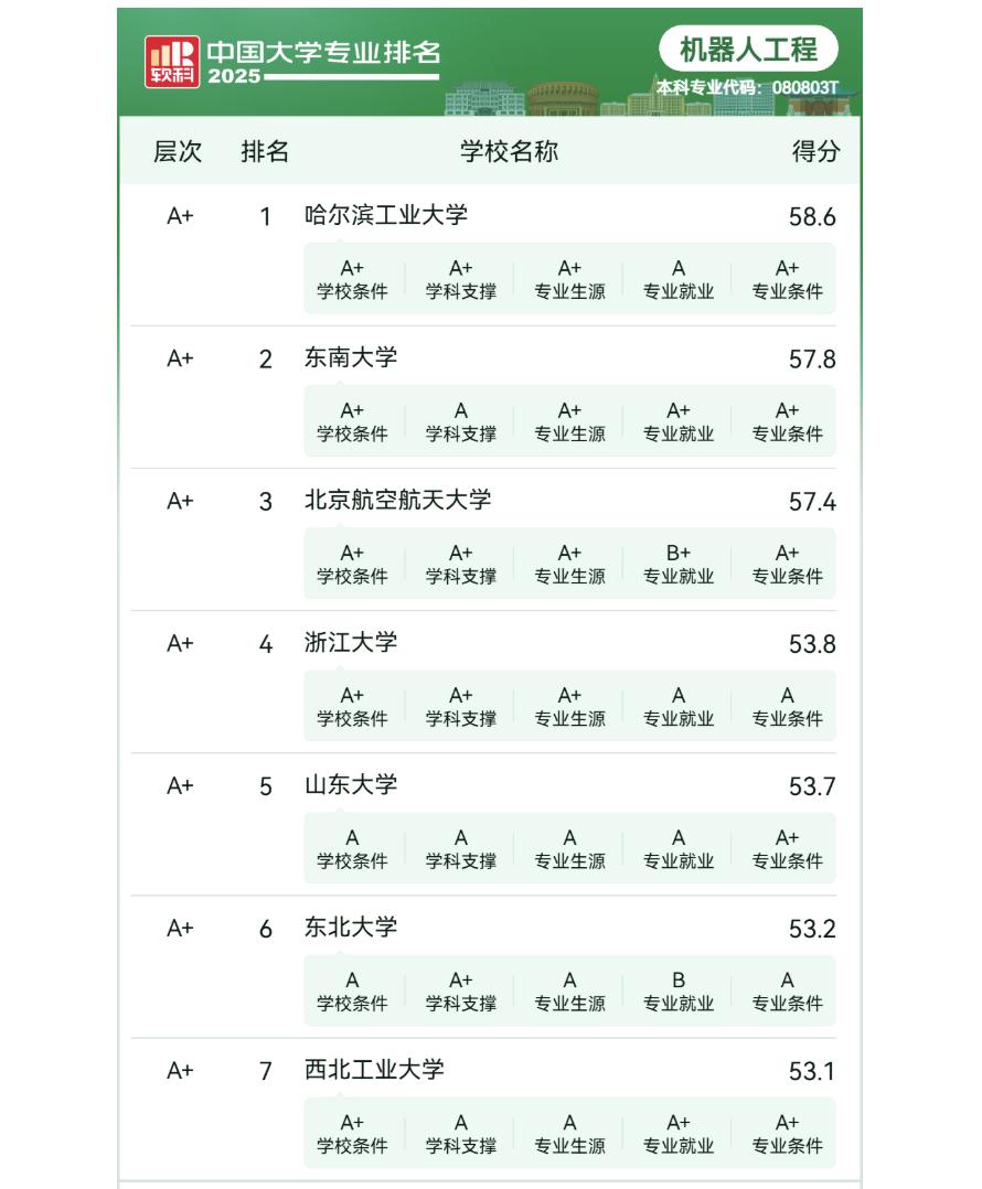 如果将范围框定在开设机器人工程专业的高校,根据2025软科中国大学专业排名,全国范围内有197所高校上榜(排名前50%)。