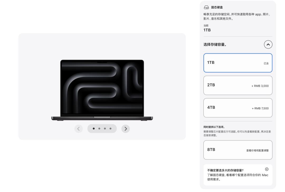 相比劈叉的统一内存,新 MacBook Pro 的硬盘反而单纯了许多,还是熟悉的 1TB、2TB、4TB、8TB 组合,以前的 512GB 选项被取消了: