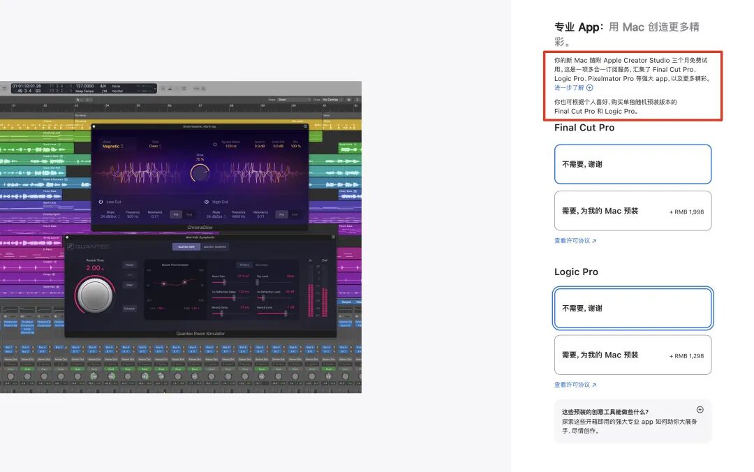 比较好玩的是,目前苹果官网的预购页面上,仍然提供 Final Cut Pro 与 Logic Pro 的买断制选项。