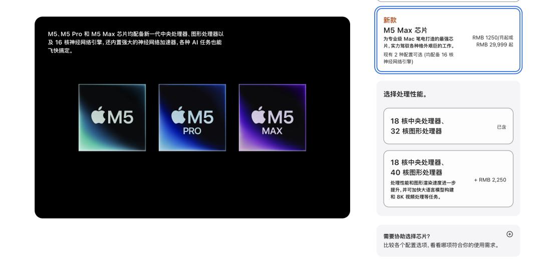 而 M5 Max 的核心配置则来到了 18 核 CPU + 32 核 GPU 起步、18 核 CPU + 40 核 GPU 封顶的规模。