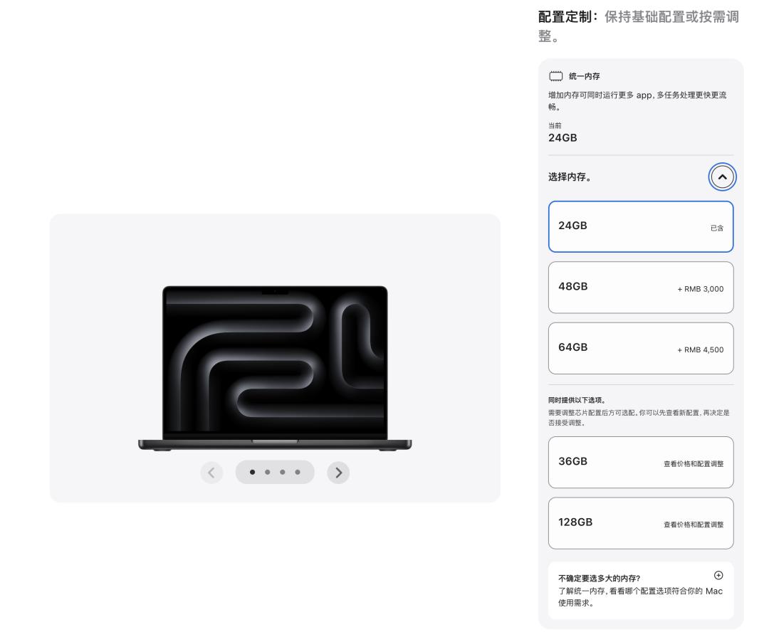 以最具代表性的 MacBook Pro 来说,本次 M5 Pro/Max 处理器依然提供 24、36、48、64、128GB 共五种可选的内存规格。