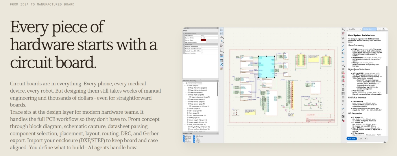 Trace为硬件团队提供设计层面的支持。它能处理整个PCB工作流程,让团队无需亲力亲为。从概念到电路图、原理图绘制、数据表解析、元件选择、布局、布线、设计规则检查(DRC)以及Gerber文件导出,一应俱全。