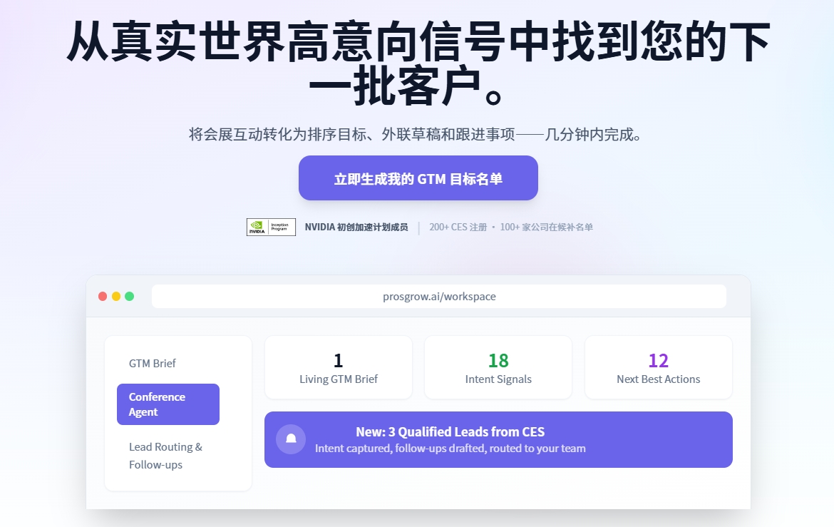 Prosgrow AI是NVIDIA初创加速计划的成员,专注于为AI与科技初创公司提供资源匹配与商业增长服务,利用NVIDIA的GPU和AI开发资源来驱动会议GTM代理,筛选潜在客户、捕获意向并分配线索。