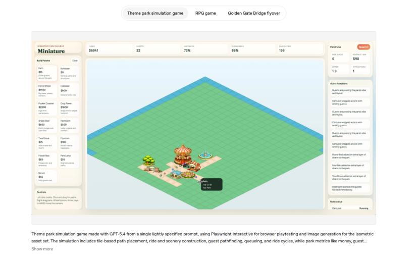 官方演示里,GPT-5.4 从一句话的提示出发,直接生成了一个等距视角的主题公园模拟游戏,带路径铺设、游客寻路、排队系统,然后自己打开浏览器去玩了一遍来检查Bug。