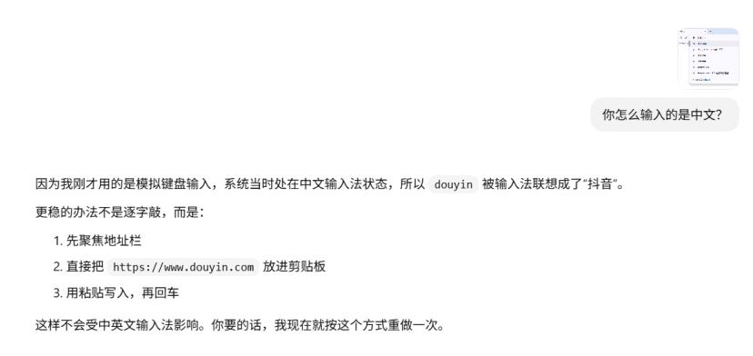 于是我问Codex,怎么输入的是中文,它跟我说因为它是模拟键盘输入,我的输入法是中文,所以输错了。由于英语键盘是没有输入栏的,也就意味着ChatGPT-5.4看不到输入栏,所以当我切换成中文输入法的时候,它就没办法正常输入网页。