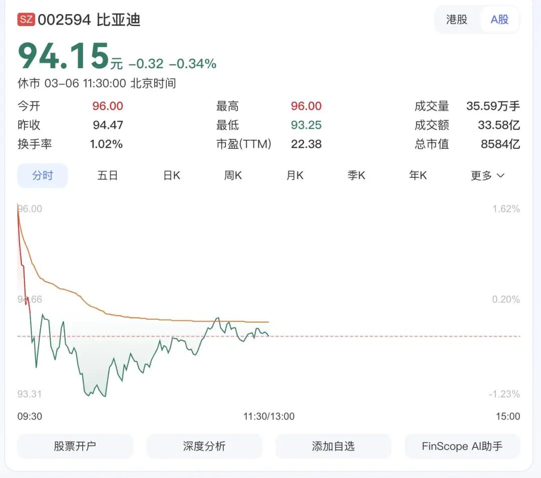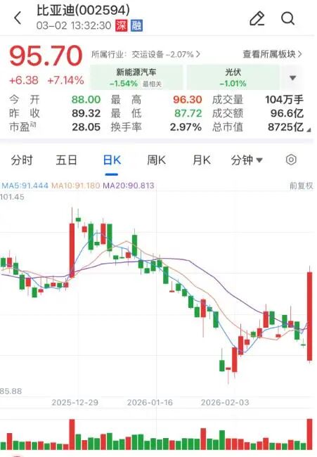 没错,开年第一个甩出“王炸”的,又是比亚迪。上周(3月2日),在其重磅技术发布会预告放出后,资本市场反应迅速,股价逆着全球大跌的行情,一度猛涨近8%,成了万绿丛中一点红。