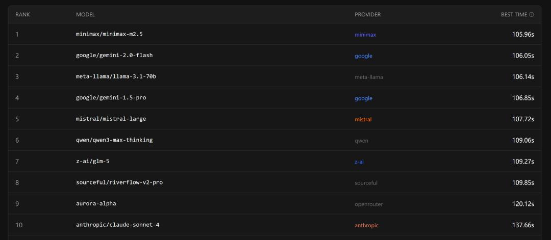 比速度,国产模型MiniMax M2.5更是一举超越Gemini、Llama等模型,登上榜首。